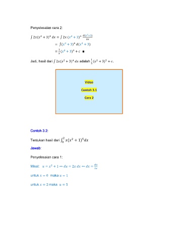 Penyelesaian cara 2: ∫ 3 = ∫ 3 + = ∫ 3 3 = 3 Jadi, hasil dari ∫ 3 adalah 3 . Video Contoh 3.1 Cara 2 Contoh 3.2: Tentukan hasil dari ∫ Jawab: Penyelesaian cara 1: Misal: = = = untuk = maka = untuk = maka =