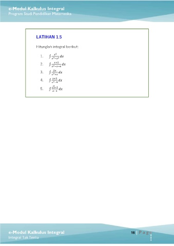 e-Modul Kalkulus Integral Program Studi Pendidikan Matematika LATIHAN 1.5 Hitunglah integral berikut: 2 1. ∫ 3 − 2 +2 2. ∫ 2 − −6 3. ∫ 2 2 + 4. ∫ +3 2 −9 5. ∫ √ −1 −1 e-Modul Kalkulus Integral 16 | P a g e Integral Tak Tentu