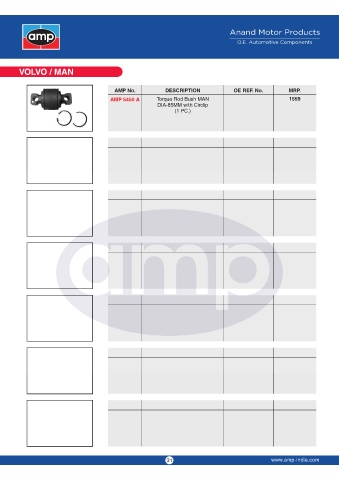 Anand Motor Products O.E. Automotive Components VOLVO / MAN AMP No. DESCRIPTION OE REF. No. MRP. AMP 5450 A Torque Rod Bush MAN 1559 DIA-85MM with Circlip (1 PC.) 31 www.amp-india.com