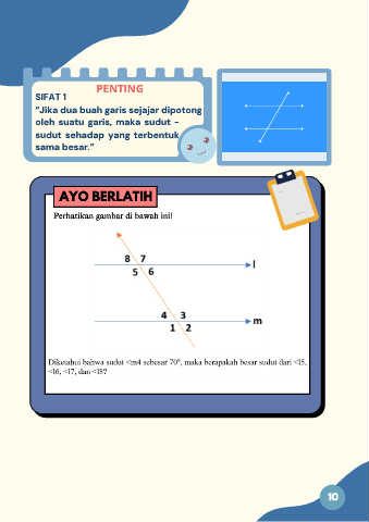 PENTING SIFAT 1 “Jika dua buah garis sejajar dipotong oleh suatu garis, maka sudut - sudut sehadap yang terbentuk sama besar.” AYO BERLATIH Perhatikan gambar di bawah ini! 10