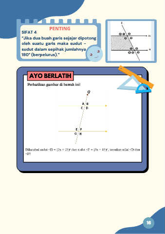 PENTING SIFAT 4 “Jika dua buah garis sejajar dipotong oleh suatu garis maka sudut - sudut dalam sepihak jumlahnya 180° (berpelurus).” AYO BERLATIH Perhatikan gambar di bawah ini! 16