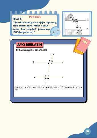 PENTING SIFAT 5 “Jika dua buah garis sejajar dipotong oleh suatu garis maka sudut - sudut luar sepihak jumlahnya 180° (berpelurus).” AYO BERLATIH Perhatikan gambar di bawah ini! 18