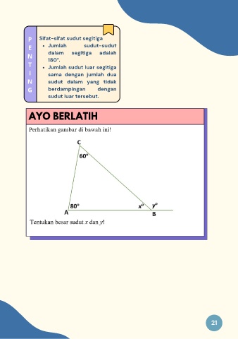 P Sifat-sifat sudut segitiga E Jumlah sudut-sudut N dalam segitiga adalah 180°. T Jumlah sudut luar segitiga I sama dengan jumlah dua N sudut dalam yang tidak G berdampingan dengan sudut luar tersebut. AYO BERLATIH Perhatikan gambar di bawah ini! 21