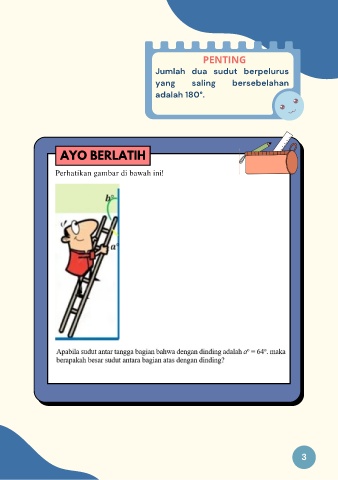 PENTING Jumlah dua sudut berpelurus yang saling bersebelahan adalah 180°. AYO BERLATIH Perhatikan gambar di bawah ini! 3