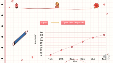 Ogive Ogive usia pengusaha 90 80 Frekuensi 70 60 50 40 30 20 10 0 15,5 20,5 25,5 30,5 35,5 40,5 Usia