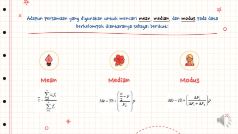 Adapun persamaan yang digunakan untuk mencari mean, median, dan modus pada data berkelompok diantaranya sebagai berikut: Mean Median Modus .