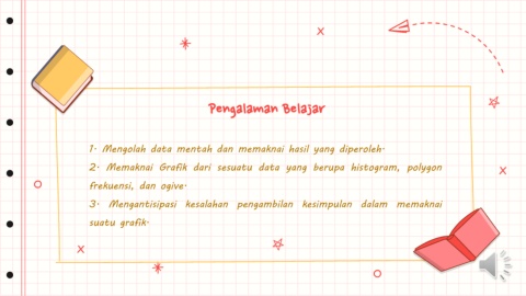 Pengalaman Belajar 1. Mengolah data mentah dan memaknai hasil yang diperoleh. 2. Memaknai Grafik dari sesuatu data yang berupa histogram, polygon frekuensi, dan ogive. 3. Mengantisipasi kesalahan pengambilan kesimpulan dalam memaknai suatu grafik.