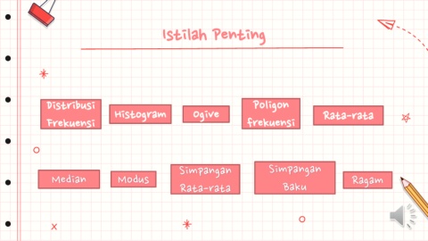 Istilah Penting Distribusi Histogram Ogive Poligon Frekuensi frekuensi Rata-rata Simpangan Simpangan Median Modus Ragam Rata-rata Baku