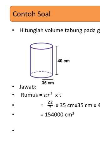 Contoh Soal • Hitunglah volume tabung pada gambar berikut! • Jawab: 2 • Rumus = x t • = x 35 cmx35 cm x 40 cm 7 3 • = 154000 cm •