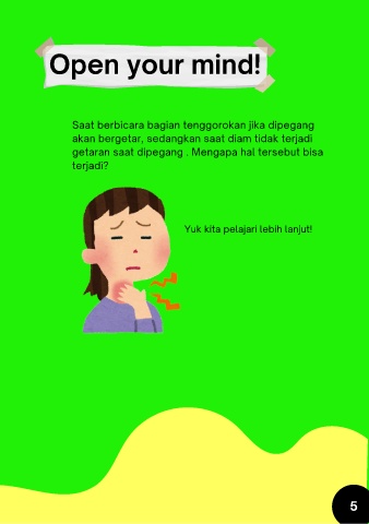 Open your mind! Saat berbicara bagian tenggorokan jika dipegang akan bergetar, sedangkan saat diam tidak terjadi getaran saat dipegang . Mengapa hal tersebut bisa terjadi? Yuk kita pelajari lebih lanjut! 5