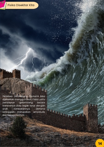 Fisika Disekitar Kita Peristiwa Gelombang Tsunami bisa dijelaskan menggunakan Fisika yaitu penjalaran gelombang secara transversal atau tegak lurus dengan arah rambatannya. Dimana ketinggian merupakan amplitudo dan kecepatannya. 14