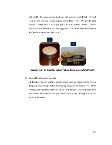 626 g/l (1 liter jagung memiliki berat 626 gram), bekatul 351 - 337 g/l,