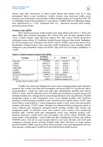 Hasil analisis persamaan model produksi padi dapat dilihat pada tabel 6.7. Pada tabel