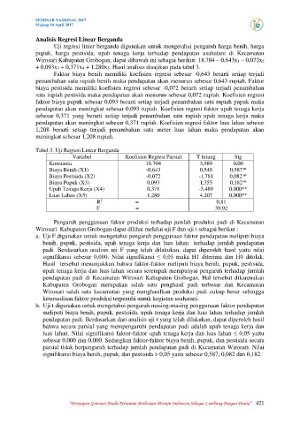 Uji regresi linier berganda digunakan untuk mengetahui pengaruh harga benih, harga
