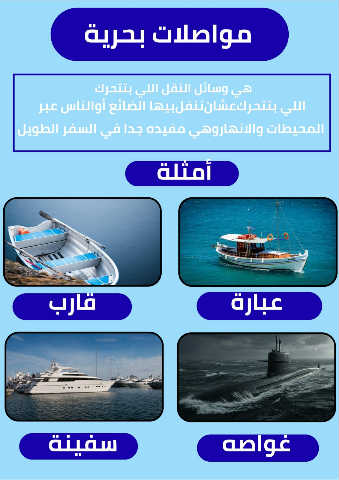 مواصلات بحرية ﻫﻲ وﺳﺎﺋﻞ اﻟﻨﻘﻞ اﻟﻠﻲ ﺑﺘﺘﺤﺮك اﻟﻠﻲ ﺑﺘﺘﺤﺮكﻋﺸﺎنﻧﻨﻘﻞﺑﻴﻬﺎ اﻟﻀﺎﺋﻊ أواﻟﻨﺎس ﻋﺒﺮ اﻟﻤﺤﻴﻄﺎت واﻻﻧﻬﺎروﻫﻲ ﻣﻔﻴﺪه ﺟﺪا ﻓﻲ اﻟﺴﻔﺮ اﻟﻄﻮﻳﻞ أﻣﺜﻠﺔ ﻗﺎرب ﻋﺒﺎرة ﺳﻔﻴﻨﺔ ﻏﻮاﺻﻪ