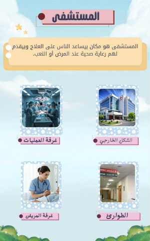 المستشفى المستشفى هو مكان بيساعد الناس على العلاج وبيقدم لهم رعاية صحية عند المرض أو التعب. غرفة العمليات الشكل الخارجي غرفة المريض الطوارئ