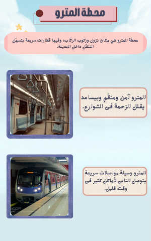 محطة المترو محّطة المترو هي مكان نزول وركوب الرّكاب ،وفيها قطارات سريعة بتسّهل التنّقل داخل المدينة. المترو آمن ومنّظم وبيساعد يقلل الزحمة فى الشوارع. المترو وسيلة مواصلات سريعة بتوصل الناس لأماكن كتير فى وقت قليل.