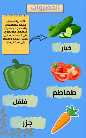 الخضروات الخضروات مصادر مهمة للفيتامينات والمعادن مع سعرات منخفضة ،كما تحتوي على ألياف تساعد في تحسين الهضم والحفاظ على صحة الجسم. خيار طماطم فلفل جزر