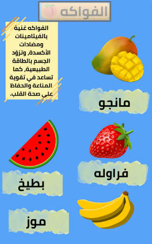 الفواكه الفواكه غنية بالفيتامينات ومضادات الأكسدة ،وتزّو د الجسم بالطاقة الطبيعية ،كما تساعد في تقوية المناعة والحفاظ على صحة القلب. مانجو بطيخ فراوله موز