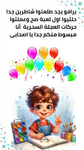 برافو بجد طلعتوا شاطرين جدا حلتيوا اول لعبة صح وعملتوا حركات العجلة السحرية أنا مبسوط منكم جدا يا اصحابى