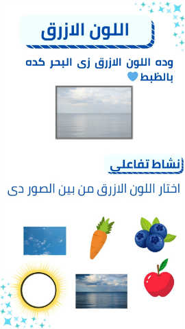اللون الازرق وده اللون الازرق زى البحر كده بالظبط نشاط تفاعلى اختار اللون الازرق من بين الصور دى