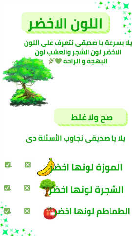 اللون الاخضر يلا بسرعة يا صديقى نتعرف على اللون الاخضر لون الشجر والعشب لون البهجة و الراحة صح ولا غلط يلا يا صديقى نجاوب الأسئلة دى ❎ ✅. الموزة لونها اخضر ❎ ✅. الشجرة لونها اخضر ❎ ✅. الطماطم لونها اخضر