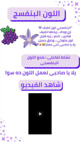 اللون البنفسج "البنفسجي لون لطيف زي وردة… ريحتها خفيف هادئ… ناعم… زيه قليل لون ملوكي… ورايق جميل . يلا يا صاحبى غنى معايا نشاط تفاعلى :صنع اللون البنفسجى يلا يا صاحبى نعمل اللون ده سوا شاهد الفيديو