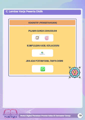 C. Lembar Kerja Peserta Didik KOGNITIF (PENGETAHUAN) PILIHAN GANDA DAN URAIAN KUMPULKAN HASIL KERJA DISINI JIKA ADA PERTANYAAN, TANYA DISINI Modul Digital Penataan Produk Kelas XII Semester Genap 19
