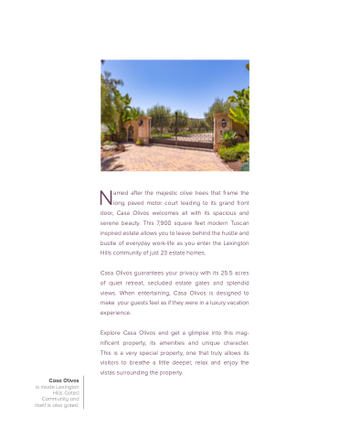 serene beauty. This 7,900 square feet modern Tuscan inspired estate allows you to leave behind the hustle and bustle of everyday work-life as you enter the Lexington Hills community of just 23 estate homes.