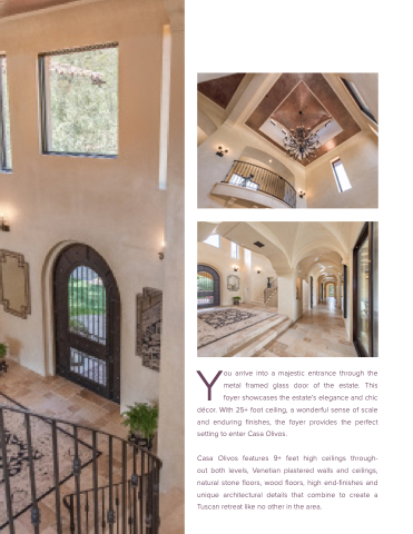 Casa Olivos features 9+ feet high ceilings through- out both levels, Venetian plastered walls and ceilings, natural stone floors, wood floors, high end-finishes and unique architectural details that combine to create a Tuscan retreat like no other in the area.