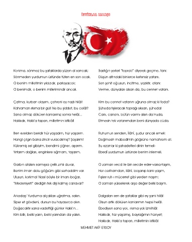 Çatma, kurban olayım, çehreni ey nazlı hilâl! Kim bu cennet vatanın uğruna olmaz ki feda?