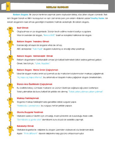reklam sloganının nasıl olması gerektiğini maddeler halinde sıralamıştır. Bir reklam sloganı,
