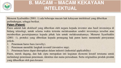 Menurut Syafruddin (2001: 1) ada beberapa macam hak kekayaan intelektual yang diberikan