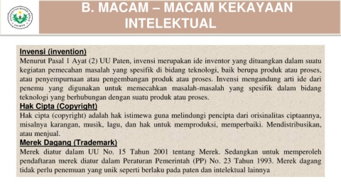 misalnya karangan, musik, lagu, dan hak untuk memproduksi, memperbaiki. Mendistribusikan,