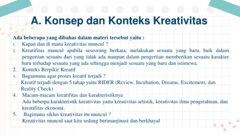 Kreatif terjadi dengan 5 tahap yaitu RIDER (Review, Incubation, Dreams, Excitement, dan