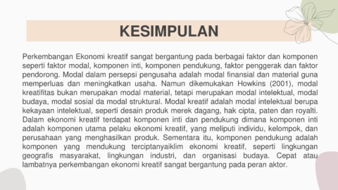 Perkembangan Ekonomi kreatif sangat bergantung pada berbagai faktor dan komponen