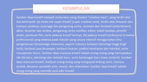 Sumber daya kreatif menjadi strata baru yang disebut "creative class", yang terdiri dari