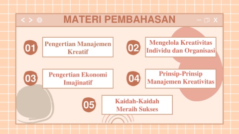 MATERI PEMBAHASAN Mengelola Kreativitas 01 Pengertian Manajemen 02 Individu dan Organisasi Kreatif Prinsip-Prinsip 03 Pengertian Ekonomi 04 Manajemen Kreativitas Imajinatif 05 Kaidah-Kaidah Meraih Sukses