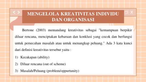 Bertone (2003) memandang kreativitas sebagai "kemampuan berpikir