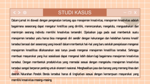 Dalam jurnal ini diawali dengan pengenalan tentang apa manajemen kreativitas, manajemen kreativitas adalah