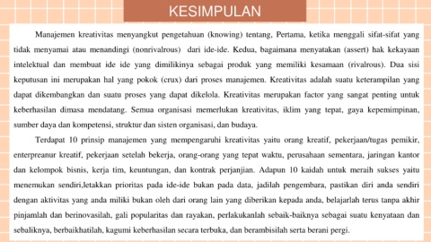 Terdapat 10 prinsip manajemen yang mempengaruhi kreativitas yaitu orang kreatif, pekerjaan/tugas pemikir,