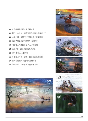 30 41 七月份攝影活動人像月賽成績 42 第四十八屆台北國際沙龍自然組作品賞析(2) 49 水墨宏村:鏡頭下的徽州詩境/周李隆德 32 55 攝影的覺醒與創作 2025 II- 邵天紳 61 碩學會士榮銜感言 & 作品/羅振誠 64 第十八期 數位影像編修基礎班 65 宏村 婺源仙境攝影團 66 冬季壩上奔馬、雪鴞、金山嶺長城攝影團 33 67 青海甘南曬佛 & 豐順火龍攝影團 68 第三十七屆理監事、會務幹部名錄 42 27 46 05