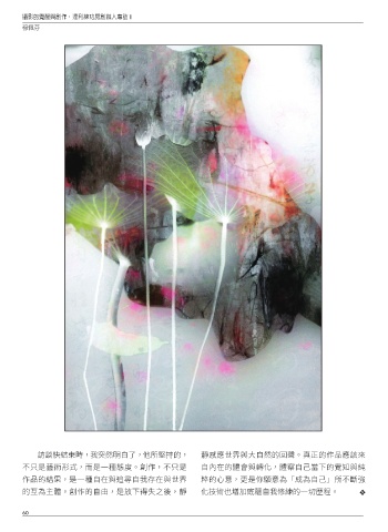 ᙲᅂٙᙂ፴ၾ௴Ъj༺лᇖ̌ג௴፬ɛਖ਼ஞ II ጒԽځ 訪談快結束時,我突然明白了,他所堅持的, 靜感應世界與大自然的回聲。真正的作品應該來 不只是藝術形式,而是一種態度。創作,不只是 自內在的體會與轉化,體察自己當下的覺知與純 作品的結果,是一種自在與追尋自我存在與世界 粹的心意,更是你願意為「成為自己」所不斷強 的互為主體。創作的自由,是放下得失之後,靜 化技術也增加底蘊自我修練的一切歷程。 60