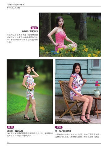 Monthly Portrait Contest ᙲᅂݺਗɛ྅˜ᒄ 優選 林錦隆/如花似玉 本張作品前景構圖不錯,但模特兒臉 部處理欠佳,畫面為橫幅構圖無法加 分,所以建議裁切成直幅更能凸顯 主題。 銅牌 優選 陳漢義/仙姿玉貌 張 仁/端莊嫻淑 由於模特兒整體的服飾及肢體語言較不上相,建議裁切 本張作品模特兒的臉部表情生澀,笑容僵硬不易掌握、 成七分身,視覺效果會更好。 背景及地板雜亂,未作霧化處理,整體感覺較不討喜。 38 38
