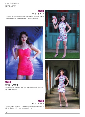 Monthly Portrait Contest ᙲᅂݺਗɛ྅˜ᒄ 入選 黃水原/亭亭玉立 本張作品構圖中規中矩。然錯過最佳快門的時間點,模特 兒臉部表情生澀,肢體語言僵硬,無法讓畫面加分。 入選 劉厚志/紅衣美女 本張作品無論是模特兒或是背景顏色均過度飽和且過於明 亮,讓模特兒失焦。 入選 黃水原/如花似玉 本張作品模特兒太正面了,無法表現肢體動作的最佳美感, 臉部皮膚處理欠佳,上面可再裁切多一點。 40 40