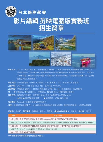 11/13(四) 1. 剪輯的準備 2. 素材的導入、內容建材與調整 3. 音樂添加與調整 4. 視頻調色實用講解 5. 實機操作