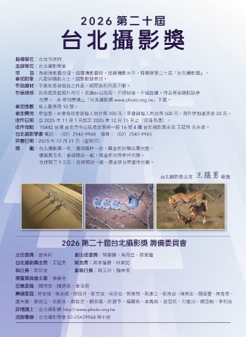 ֚ ϙ︰為促進影藝交流、倡導攝影藝術,提昇攝影水平,特舉辦第二十屆「台北攝影獎」。