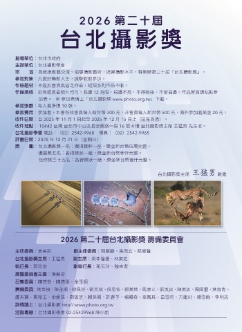 ֚ ϙ︰為促進影藝交流、倡導攝影藝術,提昇攝影水平,特舉辦第二十屆「台北攝影獎」。