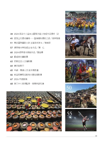 30 38 2024 第四十八屆台北國際沙龍人物組作品賞析(2) 39 45 屋頂上的豐收畫卷――篁嶺曬秋攝影之旅/周李隆德 51 專訪國際攝影大師 王龍財老師 II /穆佩芬 57 碩學會士榮銜感言 & 作品/張 仁 60 2024 碩學會士榮銜作品/魏迪春 62 挪威空拍攝影團 40 63 衣索匹亞人文攝影團 64 廣西祕探行 65 中越、南越人文 創作攝影團 66 肯亞馬賽馬拉動物大遷徙攝影團 67 2026 年鑑徵稿 68 第三十七屆理監事、會務幹部名錄 50 28 55 05