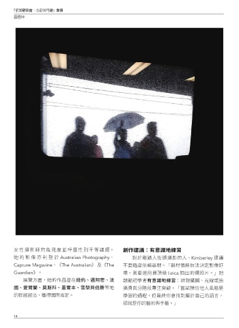 她的影像亦刊登於 Australian Photography、                      對於剛踏入街頭攝影的人,Kimberley 建議
